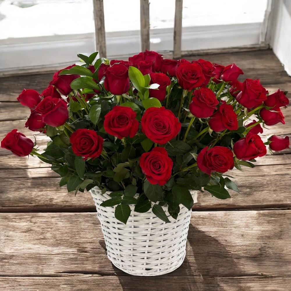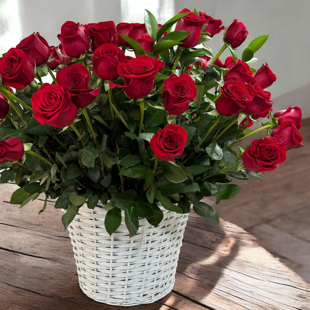 Esta sofisticada cesta de flores es la máxima expresión de elegancia y amor. Compuesta por 30 rosas de colores intensos y vibrantes, cada una seleccionada por su belleza incomparable. Acompañadas de 10 elegantes unidades de ruscus, esta cesta es el regalo perfecto para demostrar tus sentimientos a quien más amas.